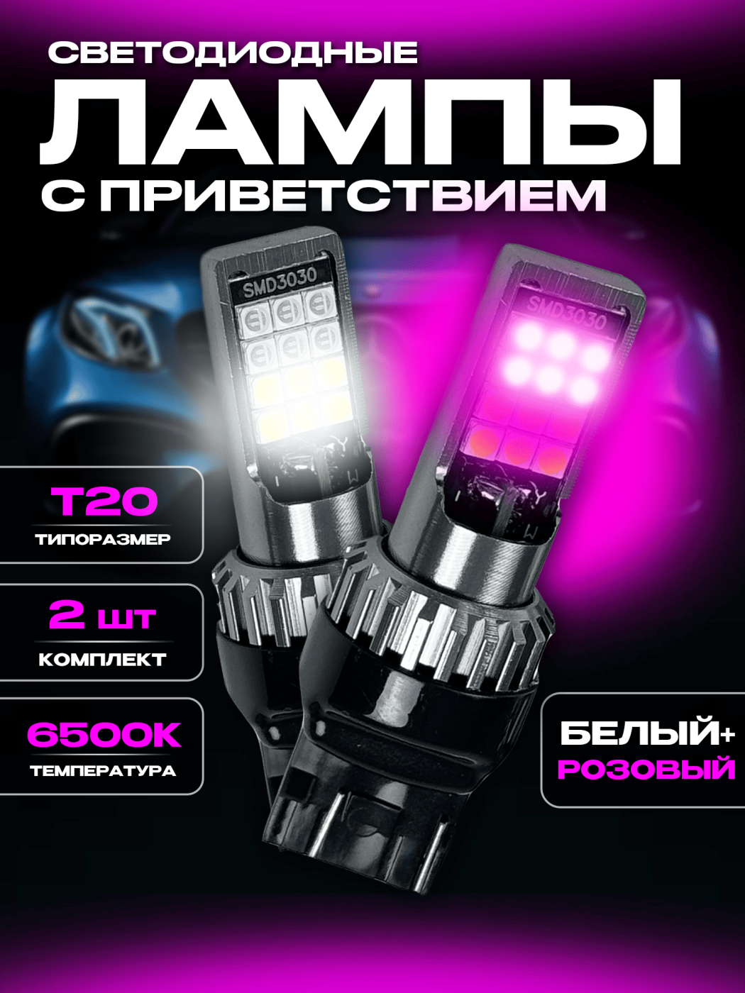 Светодиодные лампы с приветствием W21/5W T20 (розовый-белый) (2шт)